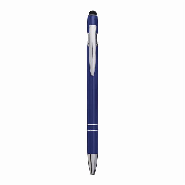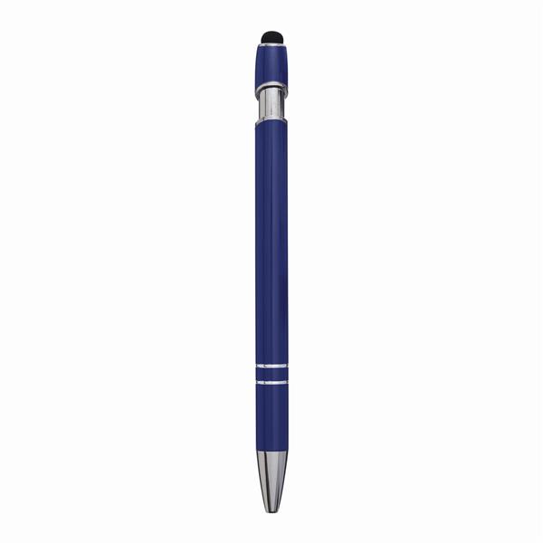 Aluminiowy długopis MERCHANT: z błyszczącą metalową obudową, mechanizmem na przycisk, gumowaną końcówką do ekranów dotykowych, niebieskim wkładem.
