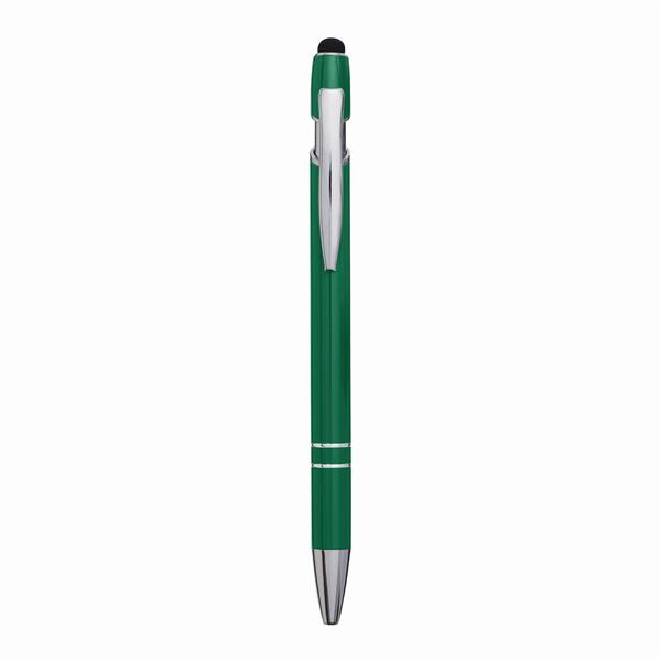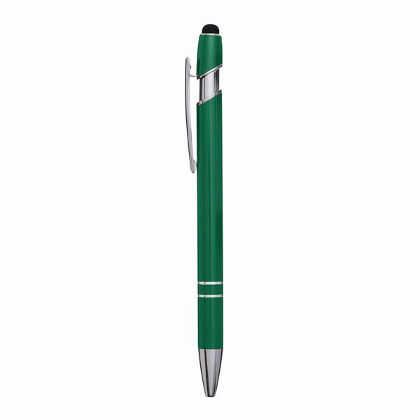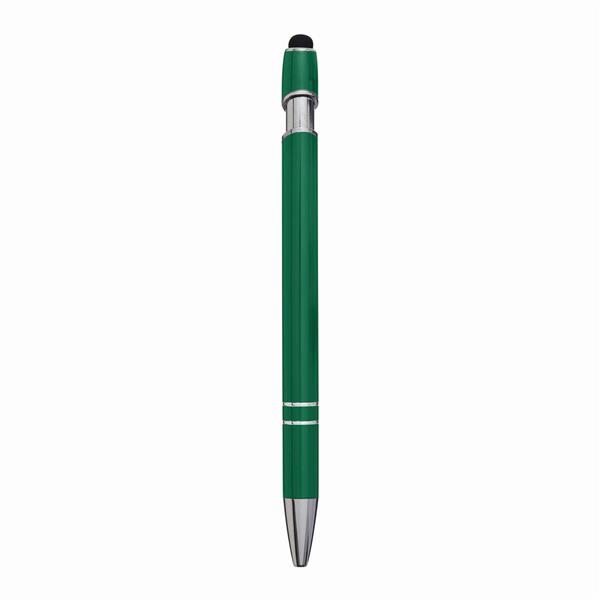 Aluminiowy długopis MERCHANT: z błyszczącą metalową obudową, mechanizmem na przycisk, gumowaną końcówką do ekranów dotykowych, niebieskim wkładem. Materiał: Aluminium/Silikon Kolor: zielony Tagi: Pióra kulkowe,ołówki,akcesoria biurowe,przybory do pisania
