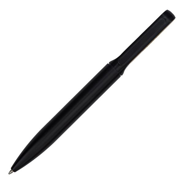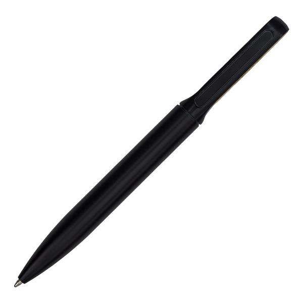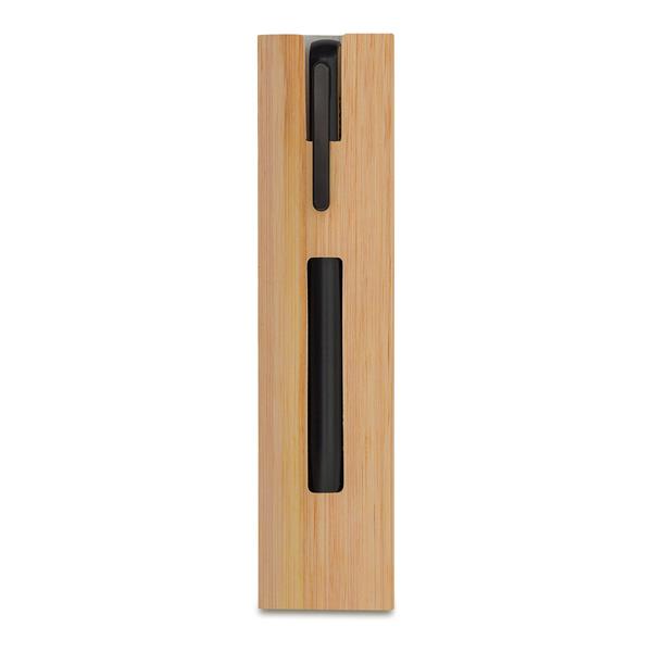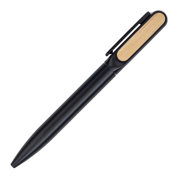 Metalowy długopis z bambusowym wykończeniem w etui. Wkład w kolorze niebieskim.