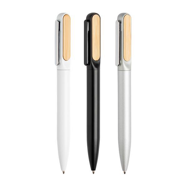 Elegancki metalowy długopis z dwoma bambusowymi elementami, które idealnie nadają się do znakowania laserowego.