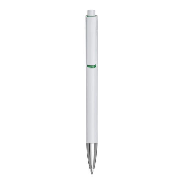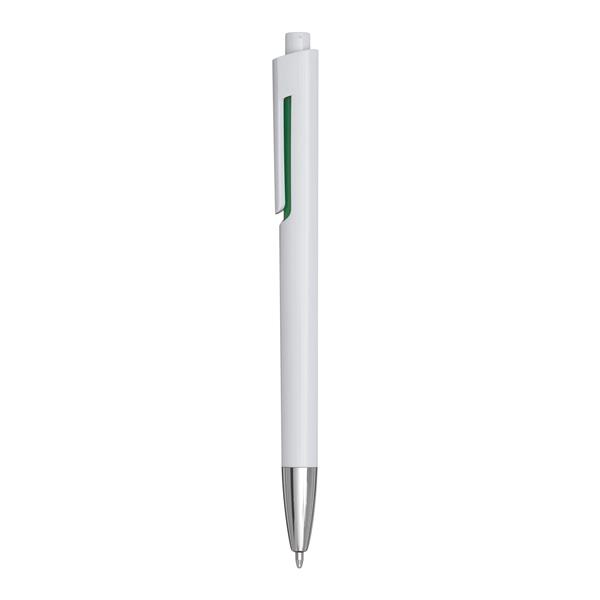 Długopis MIAMI z mechanizmem przyciskowym, kolorowym akcentem pod klipem, dużym wkładem z czarnym tuszem, długość pisania ok. 1000 m. Materiał: Plastik Kolor: biały, zielony Tagi: Długopisy,długopisy,akcesoria biurowe,przybory do pisania