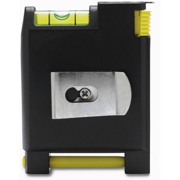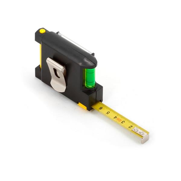 Miara 2 m z klipem umożliwiającym przyczepienie np. do paska, posiada wbudowaną poziomicę, notatnik z przezroczystą klapką zabezpieczającą przed zabrudzeniami będącą jednocześnie miejscem pod znakowanie oraz długopis z wkładem w niebieskim kolorze, produkt wykonany z między innymi z ABS