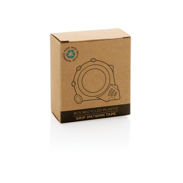 Miara 3 m, taśma o szerokości 16 mm z haczykiem i magnesami, przycisk blokady, wykonana z ABS pochodzącego z recyklingu z certyfikatem RCS (Recycled Claim Standard) który gwarantuje, że wykorzystane materiały pochodzą z recyklingu, całkowita zawartość materiału z recyklingu obliczona w oparciu o wagę całkowitą przedmiotu: 15%, uchwyt z TPR, w pudełku z papieru kraftowego z certyfikatem FSC® mix (Forest Stewardship Council), ślad węglowy produktu: 0,5 kg CO2