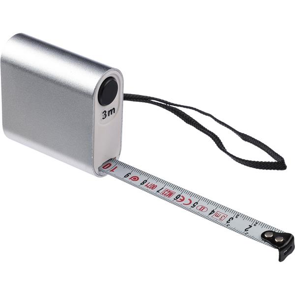 Miara 3m w centymetrach, opaska na nadgarstek ułatwiająca noszenie, zapakowana w brązowy kartonik, produkty wykonany z ABS i metalu