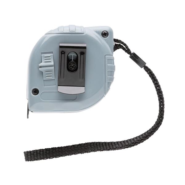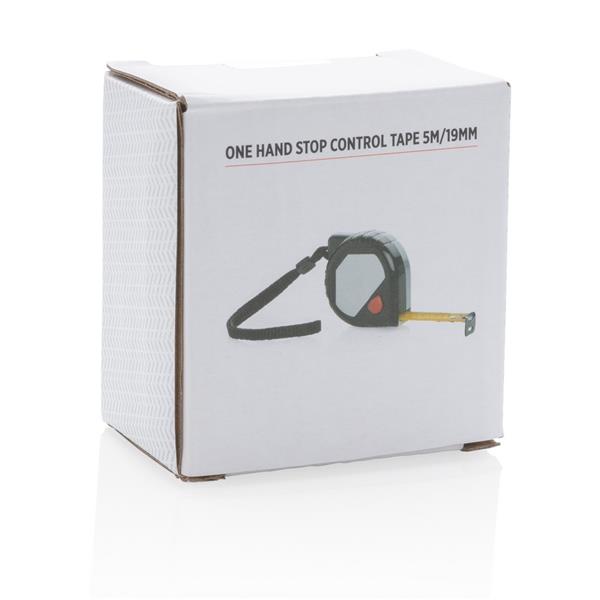 Miara 5 m, żółta taśma o szerokości 19 mm z haczykiem, przycisk pauzy i przycisk stop, kompaktowa obudowa wykonana z ABS i stali, posiada klip i pasek na rękę,