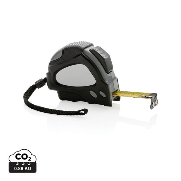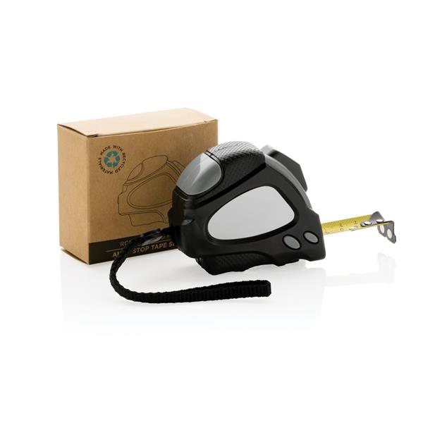 Miara 5 m, taśma o szerokości 19 mm z haczykiem i magnesami, przycisk blokady, wykonana z ABS pochodzącego z recyklingu z certyfikatem RCS (Recycled Claim Standard) który gwarantuje, że wykorzystane materiały pochodzą z recyklingu, całkowita zawartość materiału z recyklingu obliczona w oparciu o wagę całkowitą przedmiotu: 14%, uchwyt z TPR, w pudełku z papieru kraftowego