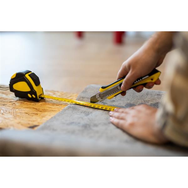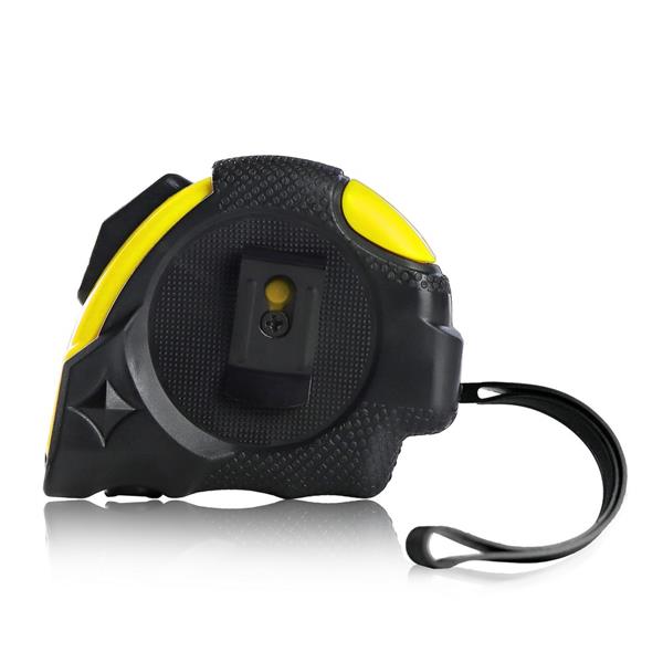 Miara 5 m z uchwytem ułatwiającym noszenie oraz dodatkowym klipem umożliwiającym przyczepienie np. do paska, na końcu znajduje się magnetyczny zaczep ułatwiający korzystanie z miary, produkt wykonany z metalu i plastiku