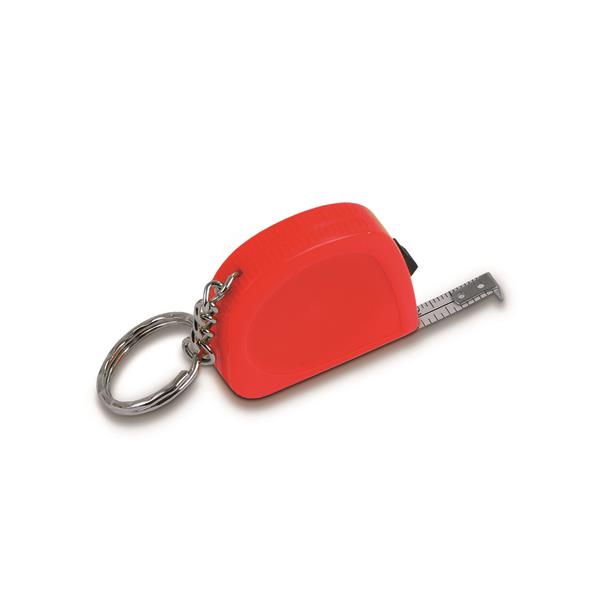 Zwijana miarka 2-metrowa, brelok, wykonana z metalu i plastiku. Podziałka w cm i calach.