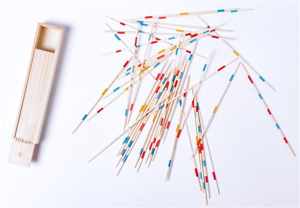 Gra Mikado (rodzaj bierek) z drewna, w drewnianym pudełku. 41 elementów.