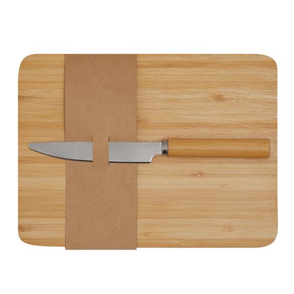 Deska do krojenia MINI BAMBOO. Bambusowa deska do krojenia, nóż ze stali nierdzewnej z uchwytem z bambusa, papierowa nakładka z miejscem na wsunięcie noża.