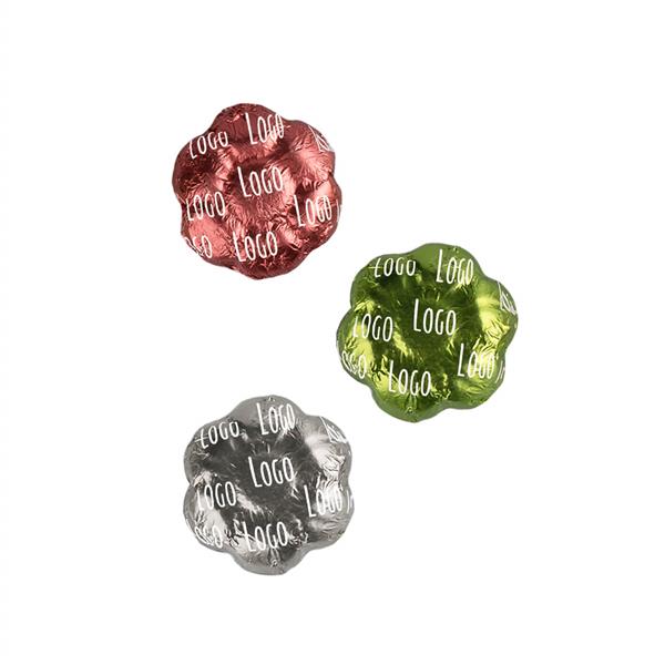 Czekoladka zapakowana jest w folię. Opakowanie możemy spersonalizować, stosując nadruk na folii w postaci wzoru powtarzalnego, a tym wzorem może być logo Twojej firmy.