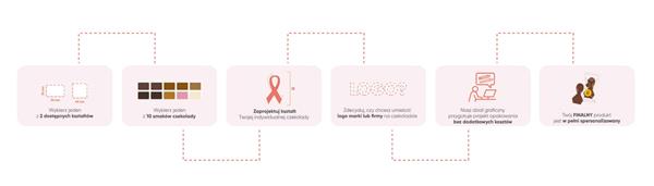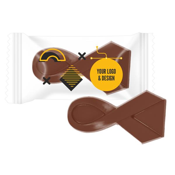 Czekoladka w Twoim indywidualnym kształcie z logo Twojej marki dostępna będzie w opakowaniu biodegradowalnym, zabezpieczona folią kompostowalną i umieszczona w pudełku papierowym bez plastikowej wypraski.