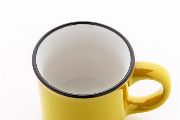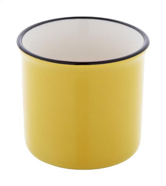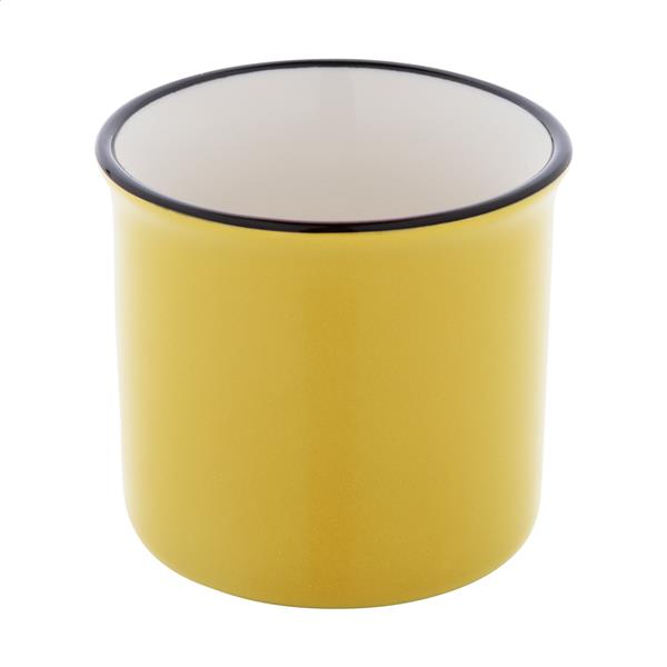 Miniaturowy, ceramiczny kubek vintage z czarną obwódką, biały w środku i kolorowy na zewnątrz, 90 ml. W pudełku z papieru typu kraft.