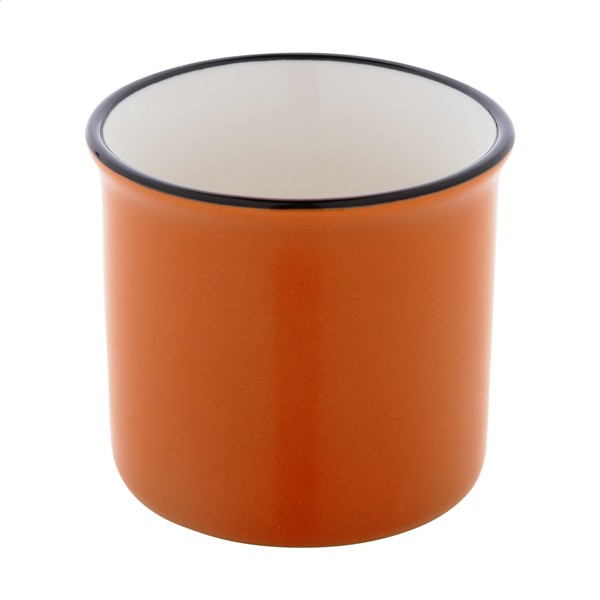 Miniaturowy, ceramiczny kubek vintage z czarną obwódką, biały w środku i kolorowy na zewnątrz, 90 ml. W pudełku z papieru typu kraft.