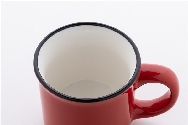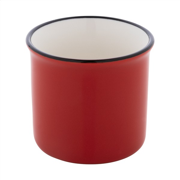 Miniaturowy, ceramiczny kubek vintage z czarną obwódką, biały w środku i kolorowy na zewnątrz, 90 ml. W pudełku z papieru typu kraft.
