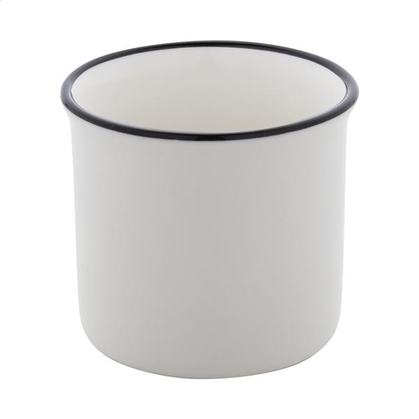 Miniaturowy, ceramiczny kubek vintage z czarną obwódką, biały w środku i kolorowy na zewnątrz, 90 ml. W pudełku z papieru typu kraft.