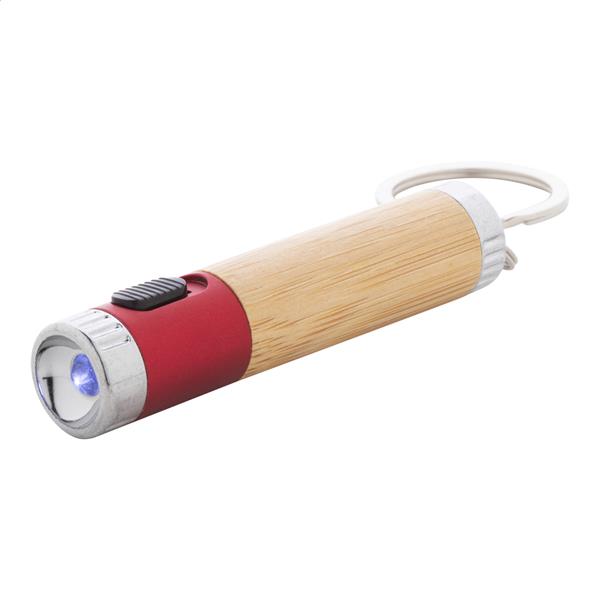 Mini latarka z bambusa i tworzywa ABS pochodzącego z recyklingu, z 1 diodą LED i metalowym brelokiem. Z baterią guzikową.
