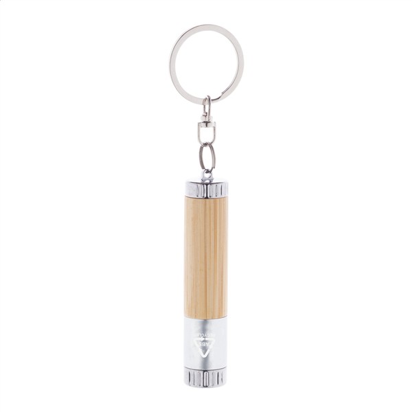 Mini latarka z bambusa i tworzywa ABS pochodzącego z recyklingu, z 1 diodą LED i metalowym brelokiem. Z baterią guzikową.