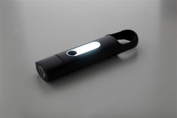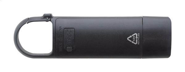 Mini latarka z recyklingowanego ABS z wbudowaną ładowalną baterią USB (200 mAh) i karabińczykiem. Z lampą COB z przodu i reflektorem COB z boku. Z 3 trybami świecenia. W zestawie kabel do ładowania USB.