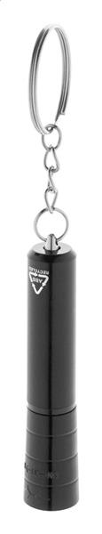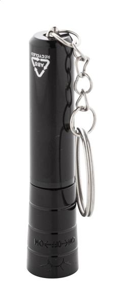 Mini latarka z 1 diodą LED z recyklingowanego plastiku ABS, z metalicznym wykończeniem i metalowym brelokiem. Z baterią guzikową.