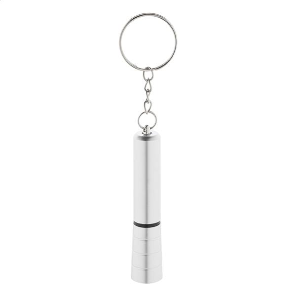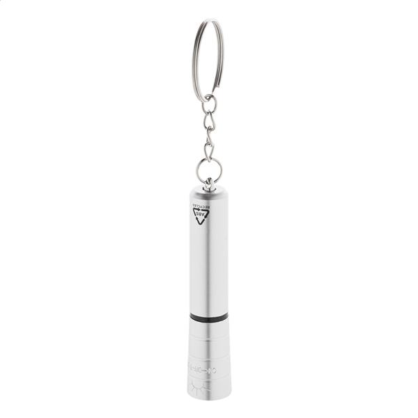 Mini latarka z 1 diodą LED z recyklingowanego plastiku ABS, z metalicznym wykończeniem i metalowym brelokiem. Z baterią guzikową.