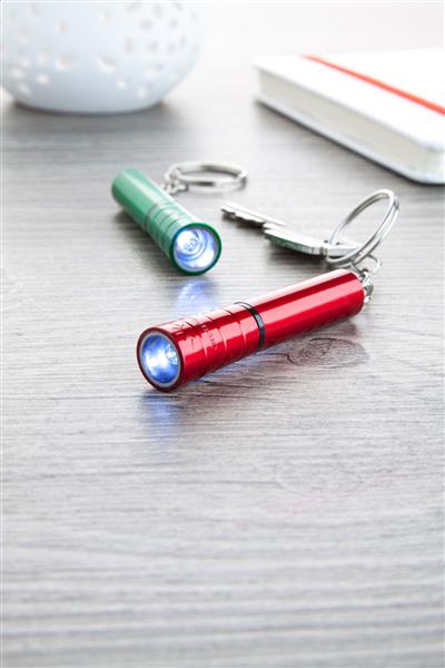 Plastikowa, mini latarka z 1 diodą LED, wykończeniem metalowym i metalowym brelokiem. Z baterią guzikową.