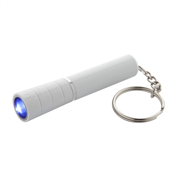 Plastikowa, mini latarka z 1 diodą LED, wykończeniem metalowym i metalowym brelokiem. Z baterią guzikową.
