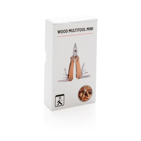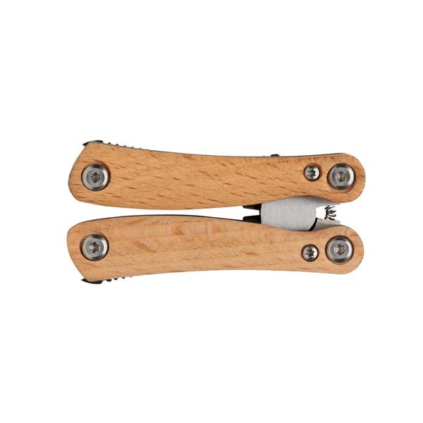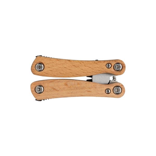 Trwałe i kompaktowe narzędzie wielofunkcyjne, wykonane z wysokiej jakości stali nierdzewnej, uchwyt z drewna bukowego, 12 funkcji: długie szczypce, kombinerki, przecinak do kabli i drutu, ostrze ząbkowane, mały nóż, średni śrubokręt płaski, otwieracz do butelek, duży śrubokręt płaski, nóż, mały śrubokręt płaski, śrubokręt krzyżakowy, pilnik i skrobak, w ozdobnym pudełku, ślad węglowy produktu: 0,56 kg CO2