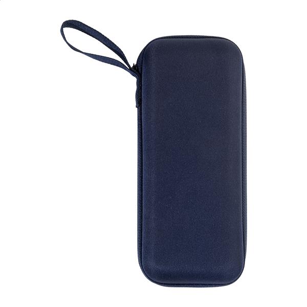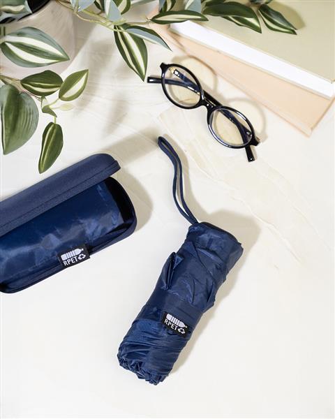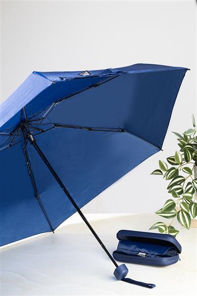 Ręczny, wiatroodporny, składany na 3 części mini parasol z 6 panelami, w pasującym kolorystycznie pokrowcu i zapinanym na zamek twardym etui EVA. Z metalową ramą, żebrami z włókna szklanego i kompaktową rączką z paskiem na rękę. Pongee 190T RPET, z charakterystyczną metką RPET.