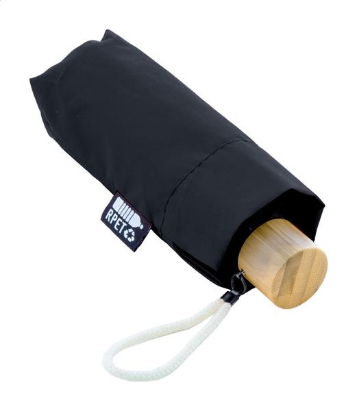 Ręcznie składany, wiatroszczelny mini parasol z 6 panelami w dopasowanym kolorystycznie etui. Z metalową ramą, żebrami z włókna szklanego, bambusową rączką i bawełnianym paskiem na rękę. Pongee 190T RPET z charakterystyczną metką RPET.