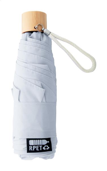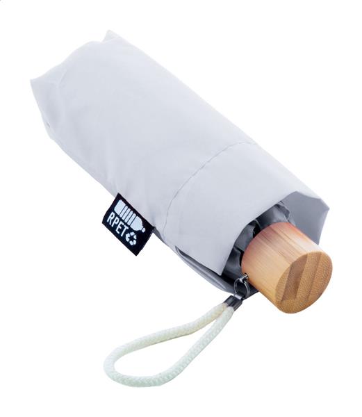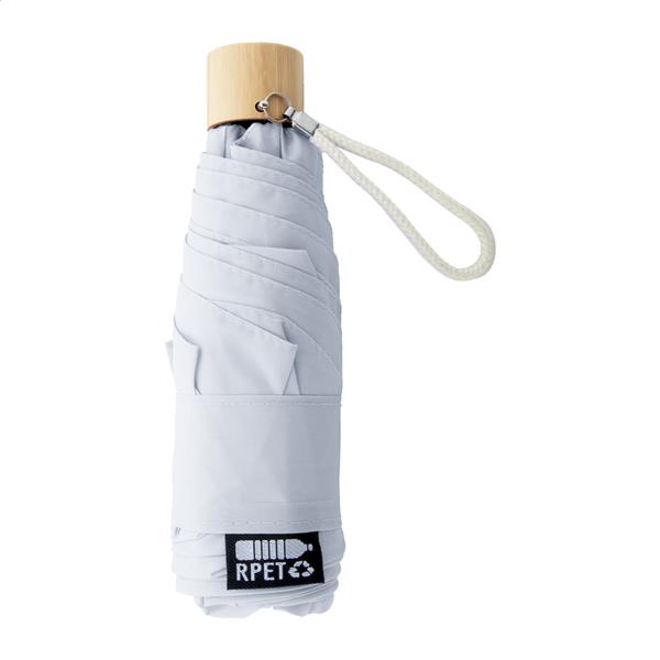 Ręcznie składany, wiatroszczelny mini parasol z 6 panelami w dopasowanym kolorystycznie etui. Z metalową ramą, żebrami z włókna szklanego, bambusową rączką i bawełnianym paskiem na rękę. Pongee 190T RPET z charakterystyczną metką RPET.