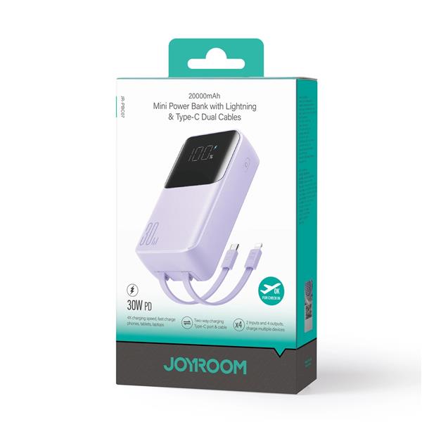Mini powerbank Joyroom JR-PBC07 o pojemności 20000 mAh i mocy do 30W z wbudowanymi kablami USB-C i Lightning – fioletowy Dla tych, którzy kochają podróże, mini powerbank Joyroom JR-PBC07 będzie gadżetem idealnym. Dlaczego? Dzięki Power Delivery zapewni błyskawiczne ładowanie, a wbudowane kable USB-C i Lightning umożliwią łatwe połączenie z iPhone’ami, jak i telefonami z Androidem. Cztery […]