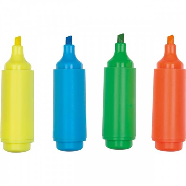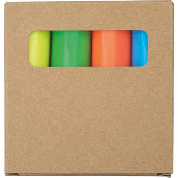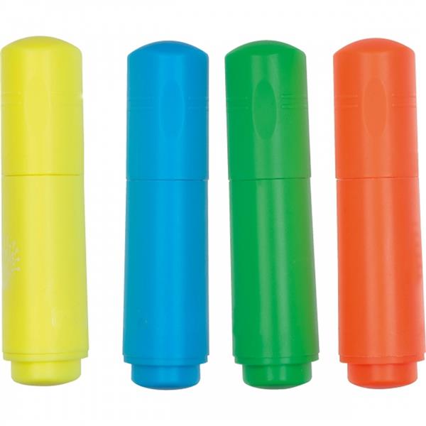 Zestaw 4 mini zakreślaczy w kolorze żółtym, niebieskim, zielonym i pomarańczowym, zapakowanych w kartonowe pudełko.