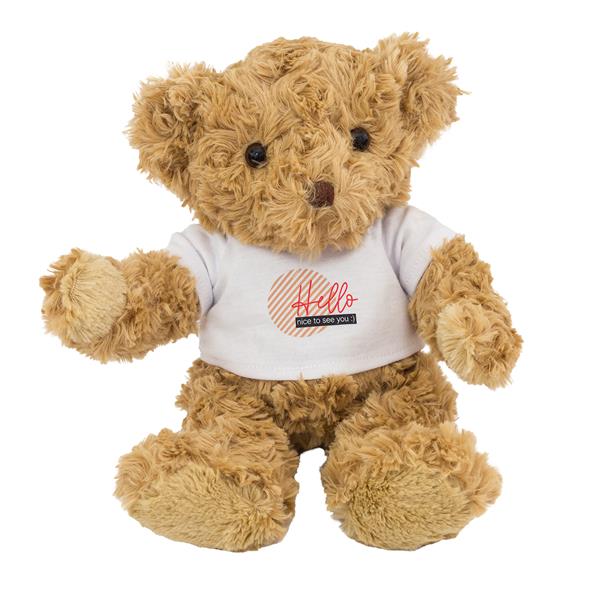 Pluszowy miś przypomni Ci dawne chwile z dzieciństwa. Miś ubrany w białą koszulkę.