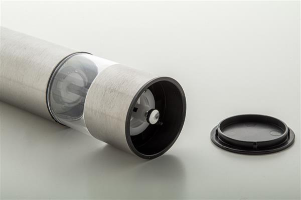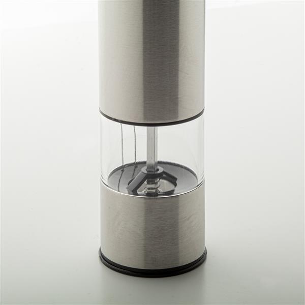 Elektryczny młynek do soli i pieprzu ze stali nierdzewnej z ceramicznym rdzeniem mielącym i oświetleniem LED. Działa na 4 baterie AA, bez baterii.