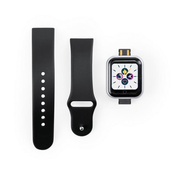 Monitor aktywności, bezprzewodowy zegarek wielofunkcyjny, BT 4.0, dotykowy wyświetlacz LCD 1.44″, bateria 50 mAh 3.7V, zasięg do 10 m, kompatybilny z iOS 9.0 (lub nowsze) lub Android 5.0 (lub nowsze), ładowany przez USB, funkcje: monitor pracy serca, monitor ciśnienia krwi, monitor natlenowania krwi, licznik spalonych kalorii, krokomierz, monitor snu, powiadomienia z aplikacji, powiadomienia o wiadomościach i połączeniach, wyzwalacz migawki, alarm, wibracje, czas i data, zabezpieczenie przed zgubieniem