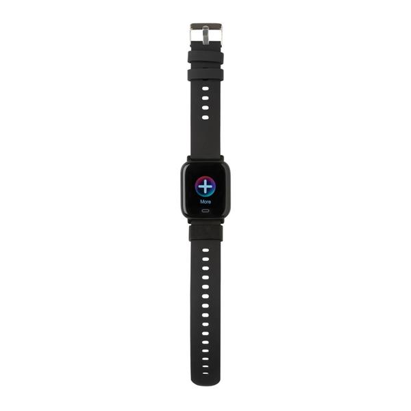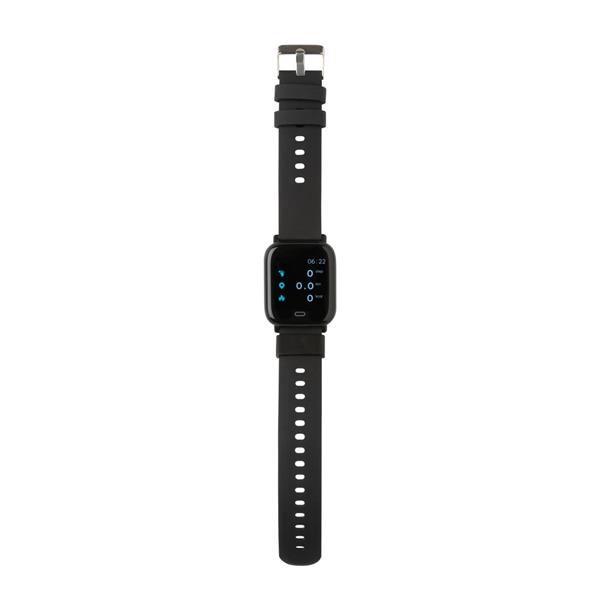 Monitor aktywności Fit Watch 1,3″, BT 5.0, wykonany z ABS z recyklingu, pasek wykonany z TPE z recyklingu, posiada certyfikat RCS (Recycled Claim Standard), całkowita zawartość materiału z recyklingu obliczona w oparciu o wagę całkowitą przedmiotu: 31%, funkcje odbierania połączeń, licznika kroków, śledzenia tętna, mierzenia ciśnienia krwi, pomiar czasu snu, kalendarz, powiadomienia z aplikacji, wodoodporność i pyłoszczelność IPX 67, kompatybilny z Androidem 4.4 oraz IOS 8.0 lub nowszymi, czas czuwania do 15 dni, czas pracy do 5 dni, ładowarka klipsowa w zestawie, w pudełku kraftowym, nie zawiera PVC