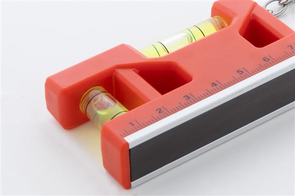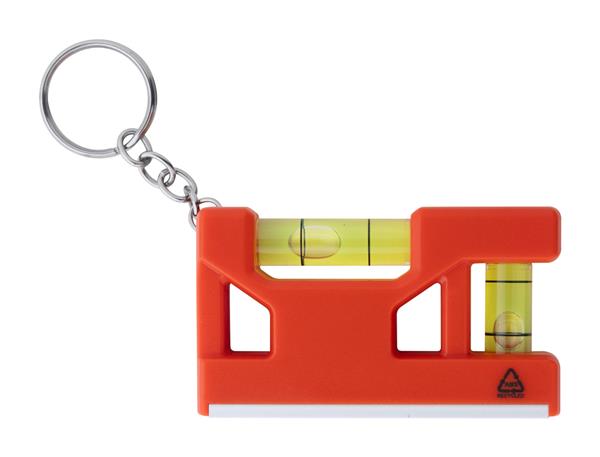 Wielofunkcyjny brelok wykonany z recyklingowanego tworzywa ABS z metalowym kółkiem, linijką, magnesem i dwiema poziomicami.