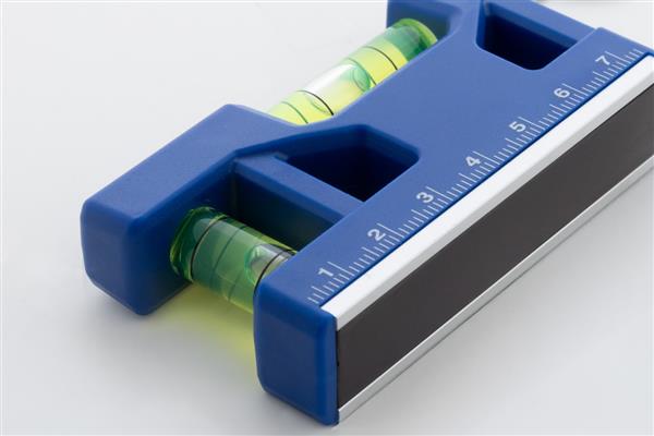 Wielofunkcyjny brelok wykonany z recyklingowanego tworzywa ABS z metalowym kółkiem, linijką, magnesem i dwiema poziomicami.