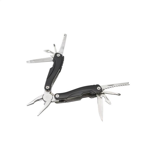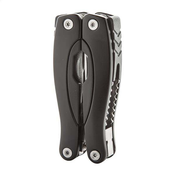 Wielofunkcyjne narzędzie ze stali nierdzewnej w czarnym opakowaniu.
