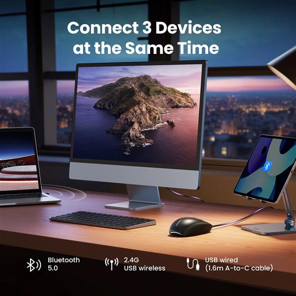 Dzięki możliwości połączenia na trzy sposoby (Bluetooth 5.0, odbiornik USB 2.4GHz oraz przewodowo przez kabel USB-A) mysz Ugreen MU103 jest niezwykle elastyczna. Przełączaj się między domowym laptopem a tabletem bez żadnych przeszkód.