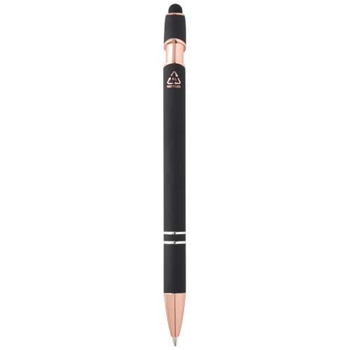Długopis Nanna z wykończeniem w kolorze różowego złota ma korpus wykonany z aluminium z recyklingu i rysik dotykowy wykonany z silikonu. Aluminium z recyklingu ogranicza ilość odpadów na wysypiskach śmieci i pomaga chronić zasoby naturalne w celu zmniejszenia emisji gazów cieplarnianych. Kolor tuszu: Niebieski. Żywotność: 800 metrów. Rozmiar stalówki: 1,0 mm.
