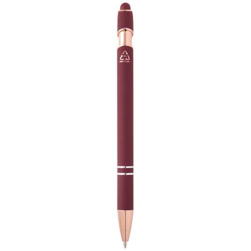 Długopis Nanna z wykończeniem w kolorze różowego złota ma korpus wykonany z aluminium z recyklingu i rysik dotykowy wykonany z silikonu. Aluminium z recyklingu ogranicza ilość odpadów na wysypiskach śmieci i pomaga chronić zasoby naturalne w celu zmniejszenia emisji gazów cieplarnianych. Kolor tuszu: Czarny. Żywotność: 800 metrów. Rozmiar stalówki: 1,0 mm.