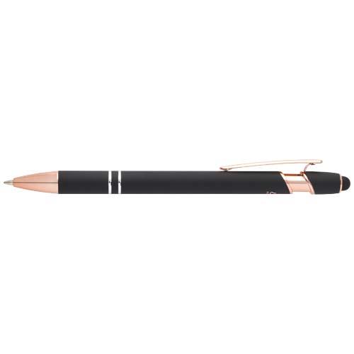 Długopis Nanna z wykończeniem w kolorze różowego złota ma korpus wykonany z aluminium z recyklingu i rysik dotykowy wykonany z silikonu. Aluminium z recyklingu ogranicza ilość odpadów na wysypiskach śmieci i pomaga chronić zasoby naturalne w celu zmniejszenia emisji gazów cieplarnianych. Kolor tuszu: Czarny. Żywotność: 800 metrów. Rozmiar stalówki: 1,0 mm.