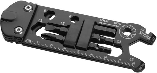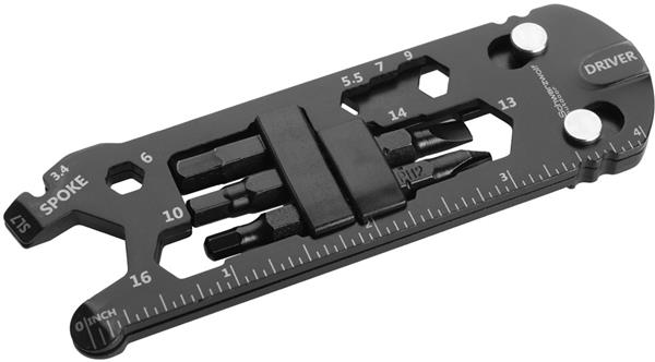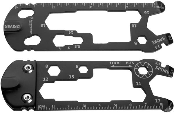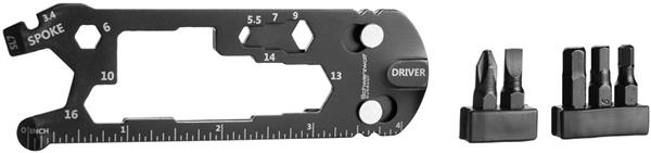Wielofunkcyjne narzędzie do roweru, wyposażone w 7 różnych narzędzi – klucz do szprych, płaski śrubokręt, śrubokręt philipps, klucz imbusowy 4/5/6mm, klucz imbusowy w romiarze od 3,3 do 18mm, otwieracz do butelek, linijka.