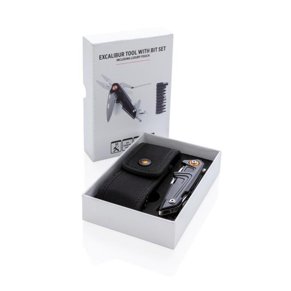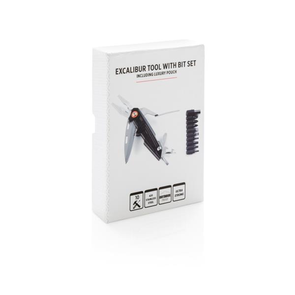 Bardzo wytrzymałe narzędzie wielofunkcyjne z zestawem 9 bitów, wykonane ze stali nierdzewnej, aluminiowy uchwyt, 10 funkcji: długie szczypce, kombinerki, przecinak do drutu i kabli, nóż, ostrze ząbkowane, otwieracz do puszek, otwieracz do butelek, śrubokręt płaski, adapter wkrętaka i zestaw końcówek wkrętakowych 9 w 1, etui z wysokiej jakości poliestru 1680D w komplecie, w ozdobnym pudełku, ślad węglowy produktu: 2,11 kg CO2