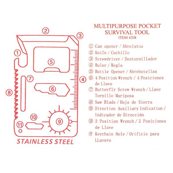 Narzędzie wielofunkcyjne w etui, 11 funkcji, otwieracz do puszek, nóż, śrubokręt, linijka, otwieracz do butelek, klucze do nakrętek, klucze motylkowe, piła, kątomierz Strona w katalogu: 409 Materiał produktu: stal nierdzewna Wymiary produktu: 8 x 5,5 x 0,3 cm Kraj pochodzenia: CN Waga produktu: 30 g Ilość szt. w kartonie wewnętrznym: 100 Ilość szt. w kartonie […]