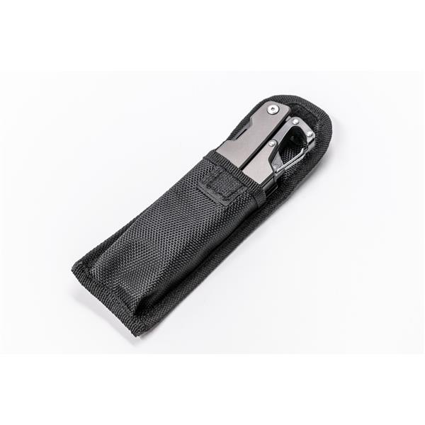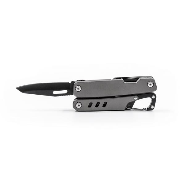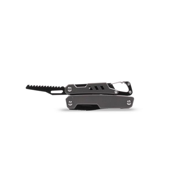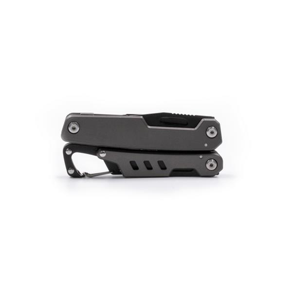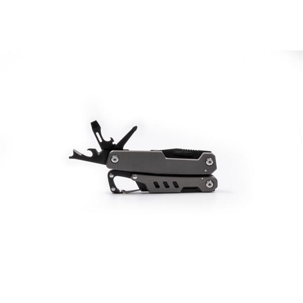Narzędzie wielofunkcyjne 11 funkcji BrandCharger Ranger, w czarnym etui, otwieracz do butelek i puszek, śrubokręt płaski i krzyżak, przecinak do drutu, nóż wielofunkcyjny, szczypce, piła i pilnik do drewna/metalu, klucz do szprych rowerowych, przecinak do kabli i drutu, linijka metryczna i calowa, zapakowany w czarne papierowe pudełko, produkt wykonany ze stali nierdzewnej i aluminium