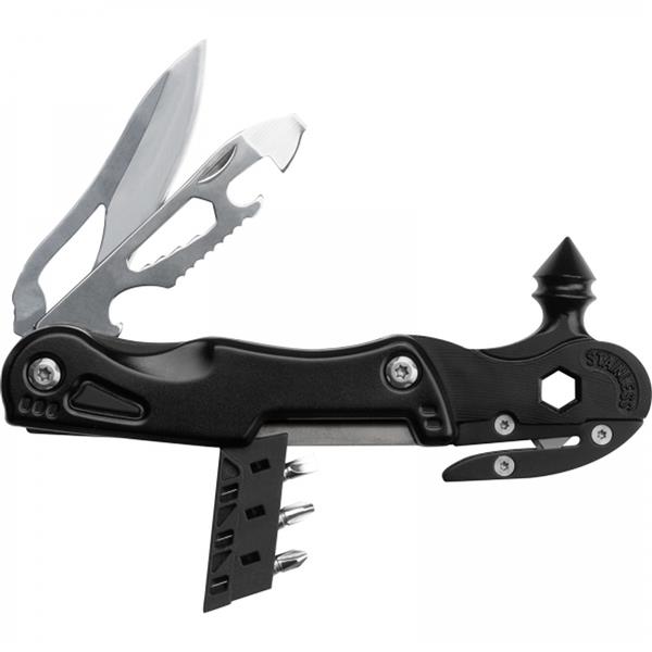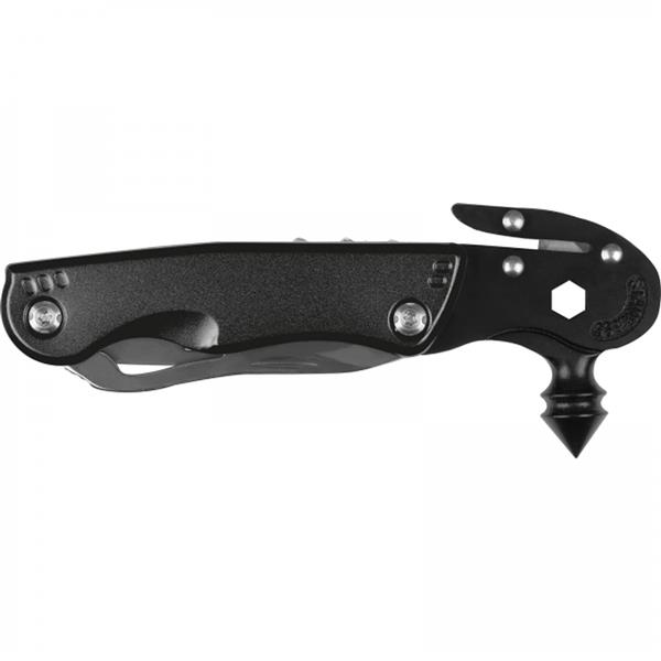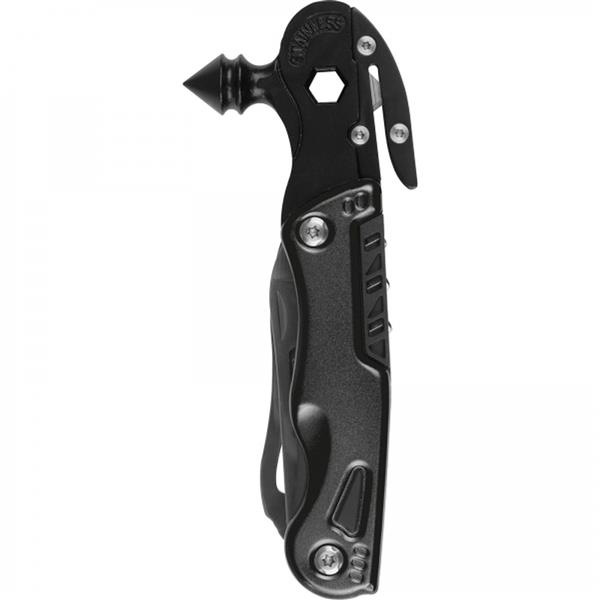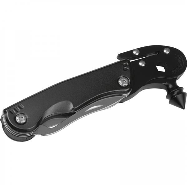Multinarzędzie wykonane z metalu, posiada lampkę LED, młotek awaryjny, śrubokręt, klucz, otwieracz, nóż i przecinak do pasów bezpieczeństwa. Narzędzie zapakowane w pokrowiec. Produkt zawiera baterie.