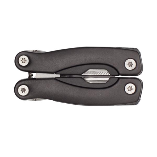 Narzędzie 9 funkcyjne w aluminiowej obudowie stanowiące wersję kieszonkową narzędzia Feat. Ostrza wykonane ze stali nierdzewnej. Pakowane w poliestrowe etui. Narzędzie zawiera: nóż, wkrętak PH krzyżowy, otwieracz do butelek, wkrętak płaski średni, nóż z ostrzem typu serrated, szczypce uniwersalne z nożycami do cięcia drutu, wkrętak płaski mały, otwieracz do konserw, pilnik pojedynczy jednorzędowy i podwójny jednorzędowy.